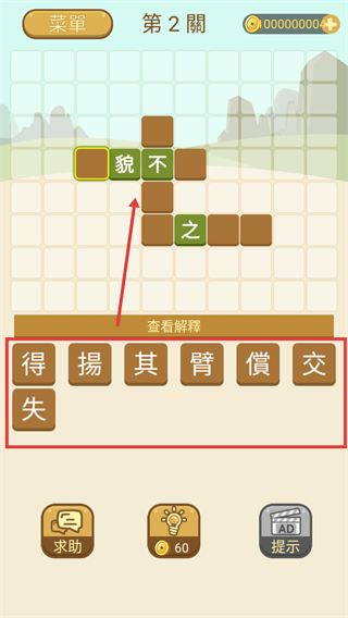 3、在成語關卡中,從底部備選字里選對應字填空,可借助【求助】【提示】功能輔助解題。