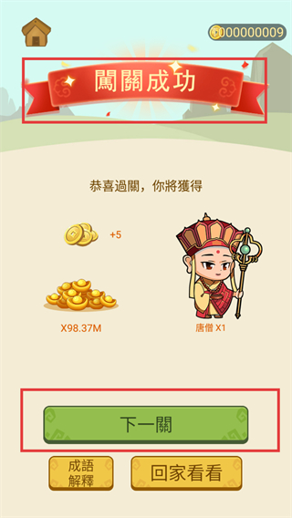 4、達成【闖關成功】后,將獲得相應資源獎勵,點擊【下一關】按鈕繼續參與關卡挑戰。