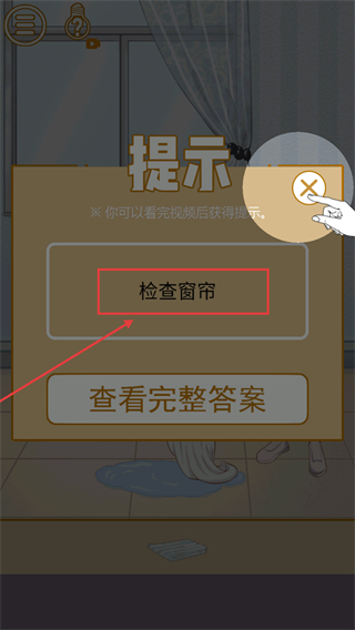 3、按照提示查看【窗簾】區(qū)域,從中尋找隱藏的線索或道具,助力推進(jìn)解謎進(jìn)程。