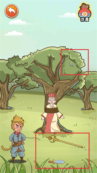 2、在該關卡場景里,留意樹上的物品與地面的武器類道具,交互這些元素來推進【救出唐僧】的任務進程。