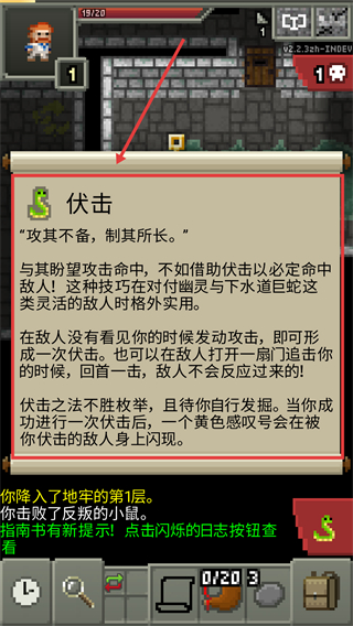 2、進入地牢后查看【伏擊】指南,學習敵人未察覺或開門時觸發伏擊的技巧,提升攻擊命中率。