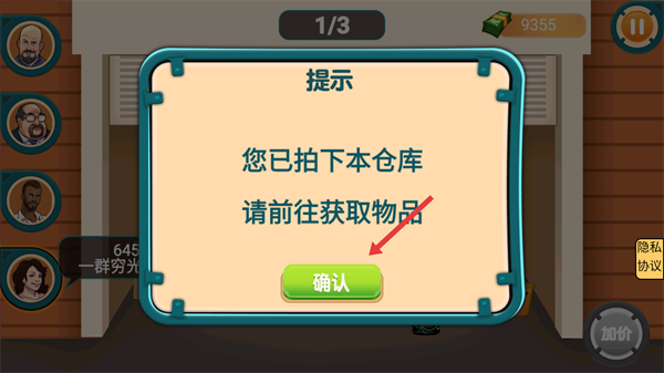 4、競拍成功后,會彈出提示彈窗,點擊【確認】按鈕,即可前往該倉庫獲取對應(yīng)的物品獎勵。