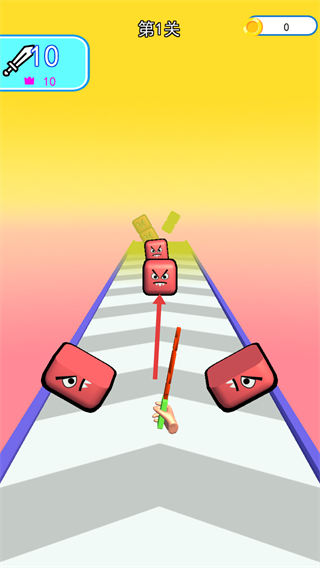 2、游戲過程中,操控武器(如界面內的長棍),攻擊路徑上出現的敵方方塊角色,積累界面左上角對應的數值(劍、皇冠標識)。