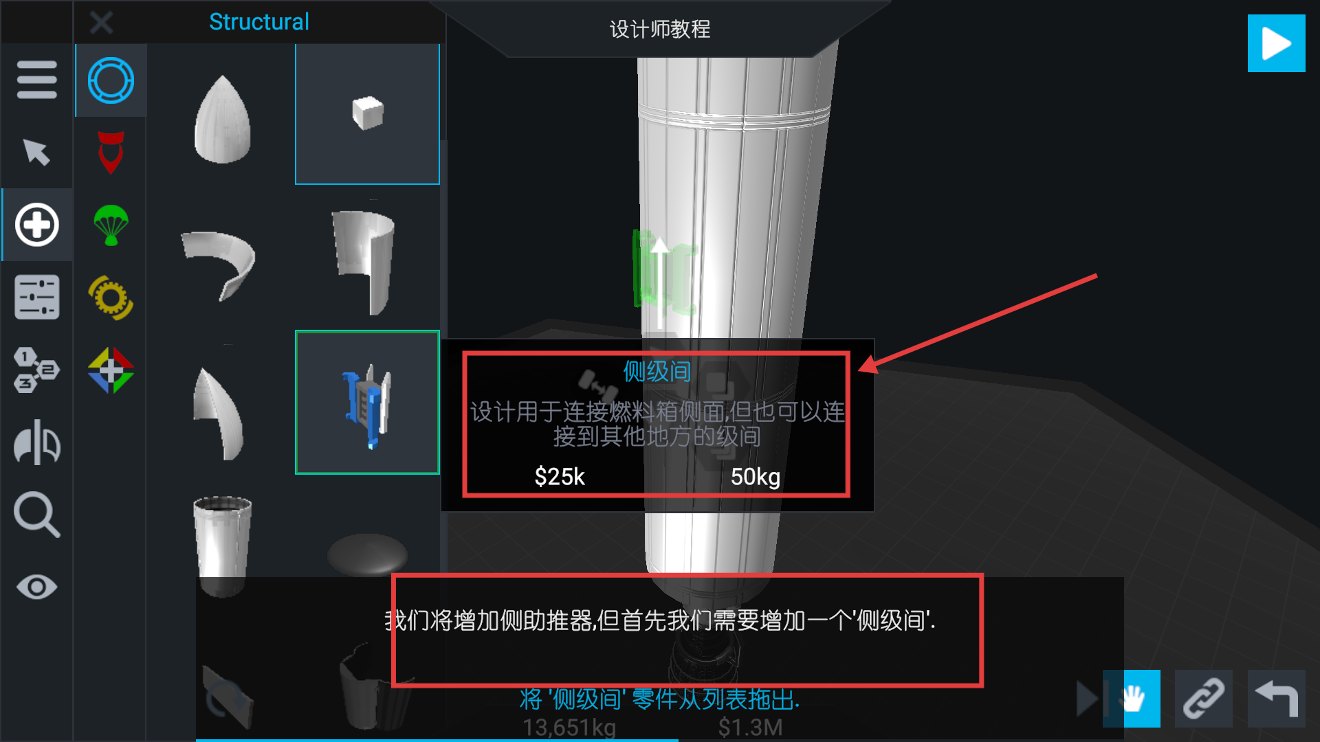 1、安裝【側(cè)級間】可連接燃料箱側(cè)面,為后續(xù)增加助推器做準(zhǔn)備,按提示從零件列表拖出即可。