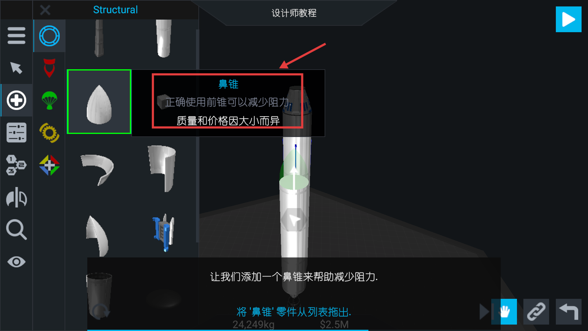 2、安裝【鼻錐】能減少飛行阻力,質(zhì)量和價格因大小而異,從零件列表拖出對應(yīng)部件安裝。