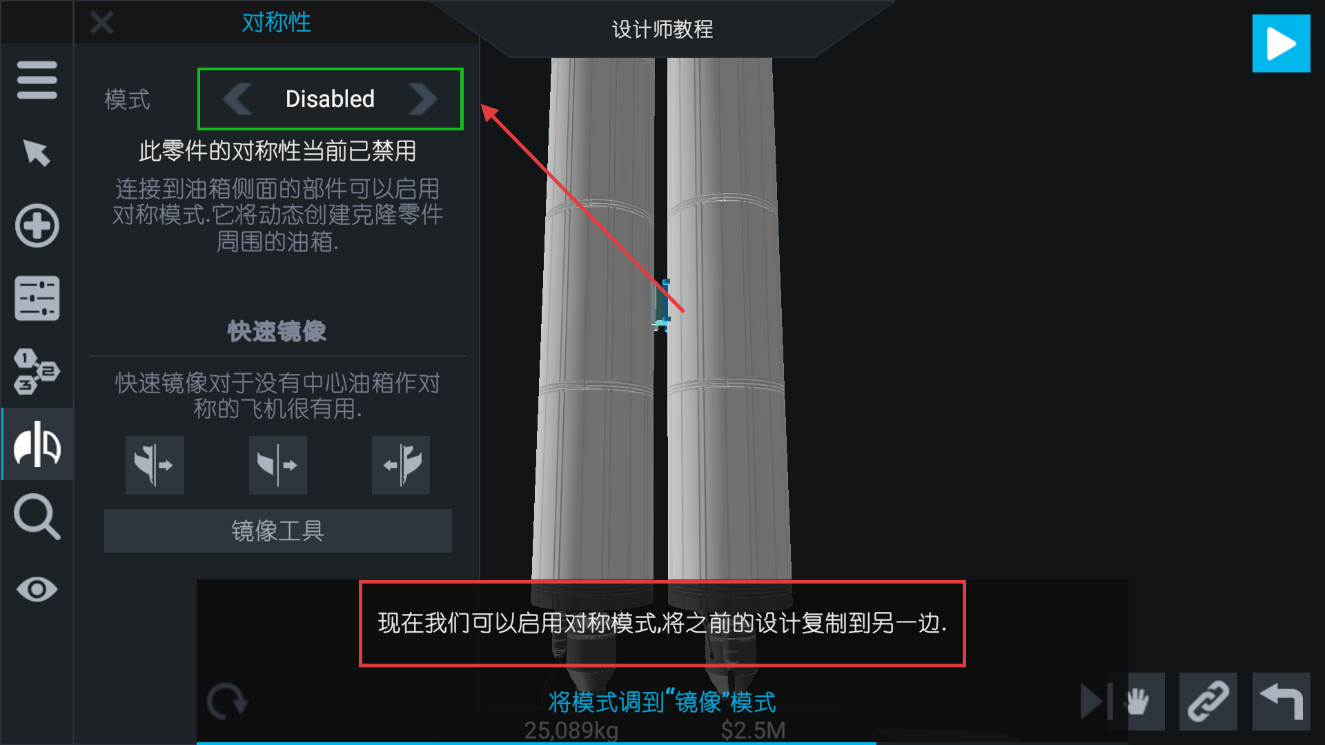 3、啟用【對稱性】-【鏡像】模式,快速復(fù)制已裝零件,讓火箭兩側(cè)設(shè)計對稱,提升建造效率。