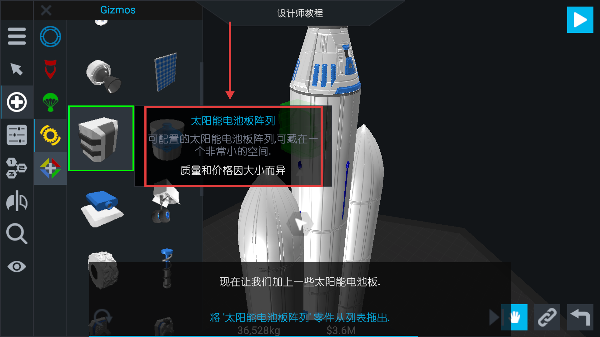 4、安裝【太陽能電池板陣列】,它可藏于小空間且可配置,為火箭供能,從列表拖出安裝。