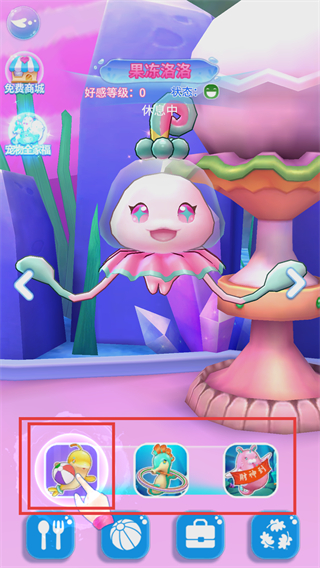 1、界面顯示寵物【果凍洛洛】,選擇底部【排球】類互動道具,與寵物進行游玩互動,可提升其好感等級。