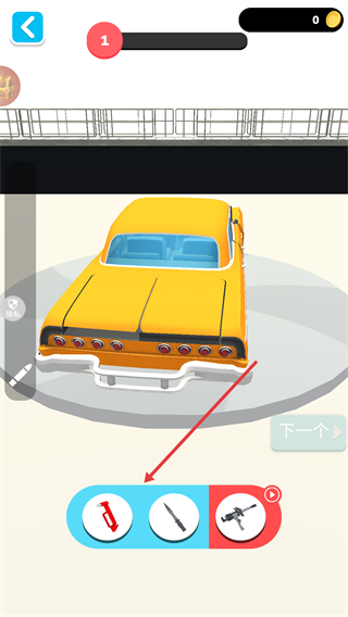 2、使用底部的【扳手】-【刀子】-【噴槍】工具破壞汽車尾部,積累進度解鎖新關卡和強力武器。