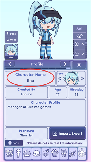 4、確認【CharacterName】改為【tina】后,可繼續編輯檔案其他信息,完善角色資料內容。