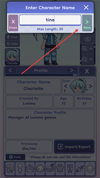 3、點擊【CharacterName】輸入框,輸入【tina】后點擊【Save】按鈕,完成角色名稱修改。