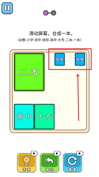 2、滑動屏幕調整方塊位置,按【幼教】-【小學】-【初中】-【一本】路徑,合并相同方塊升級。