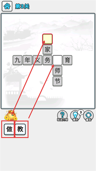 2、處于【第2關】時,選擇底部的【做】【教】填入對應空格,組成相關成語,可使用【提示】功能輔助解題。
