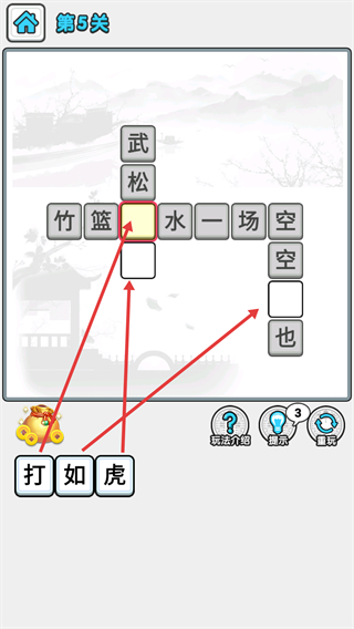 3、在【第5關】中,選取底部的【打】【如】【虎】填入空缺處,拼接成【武松打虎】等成語,推進關卡進度。