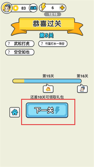 4、通關后,查看本次完成的成語,點擊【下一關】按鈕繼續挑戰。