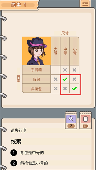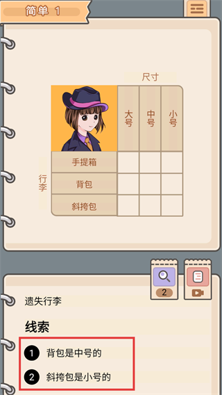 2、查看【線索】獲取信息,背包是中號的,斜挎包是小號的。