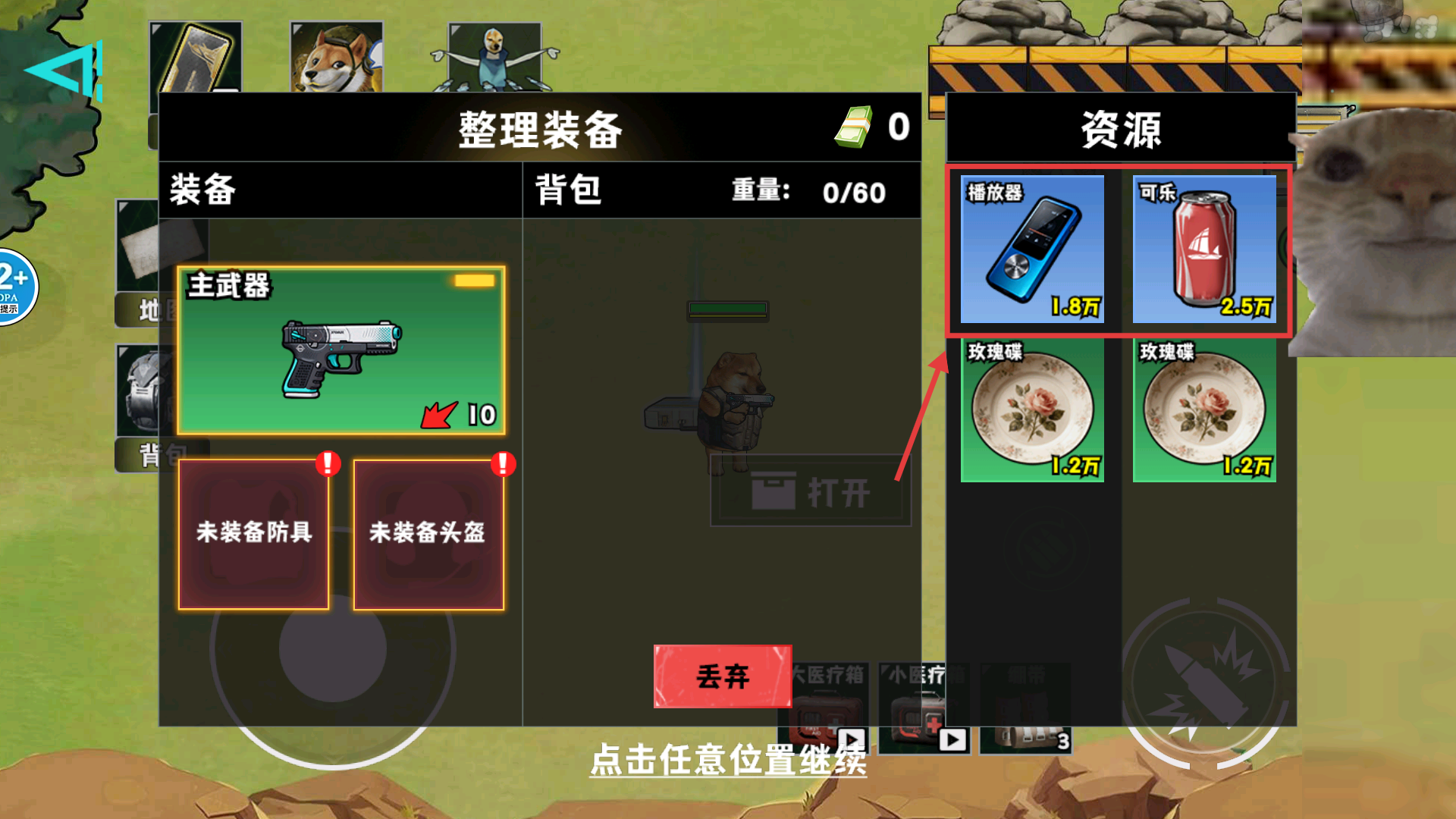 2、進(jìn)入整理裝備界面,將主武器裝備好,同時拾取背包中【播放器】-【可樂】等資源。