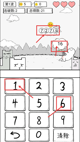 2、第1波關卡中,計算被框選數字【7+2+7=16】,點擊數字鍵輸入結果16,擊破目標提升擊破數與總得分。