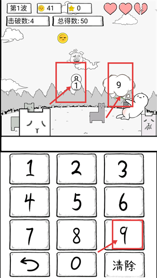 4、玩法圍繞加法運算展開,左側鬼畜怪攜帶數字,需計算數字總和后在游戲鍵盤輸入答案,鬼畜怪移出右側會扣除血量,血量耗盡游戲失敗。