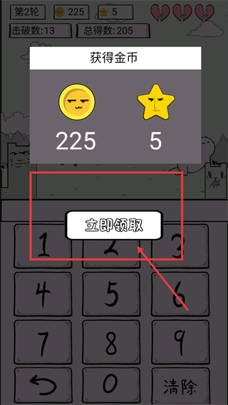 4、關卡結束后顯示獲得【225金幣】與【5星星】,點擊被框選的【立即領取】按鈕,獲取獎勵并準備下一輪挑戰。