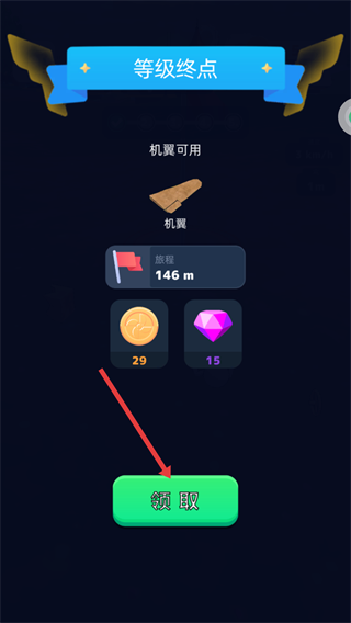 4、到達【等級終點】后,點擊綠色的【領取】按鈕,獲取【29】金幣、【15】鉆石及可用的機翼道具。
