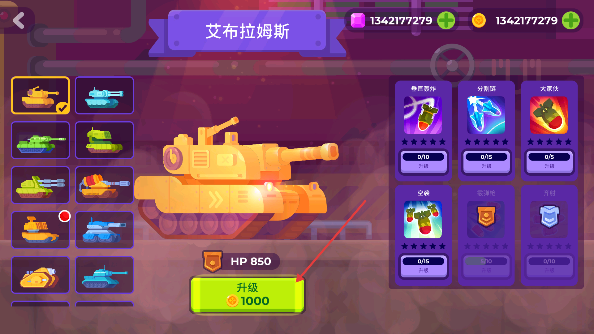 1、在坦克選擇界面,點擊【艾布拉姆斯】的【升級】按鈕,消耗【1000】貨幣提升坦克屬性增強戰(zhàn)斗能力。