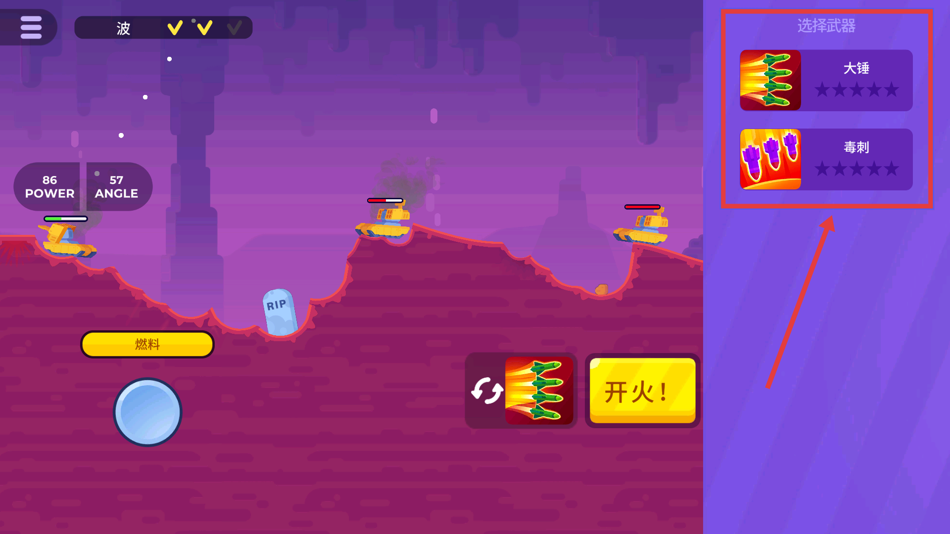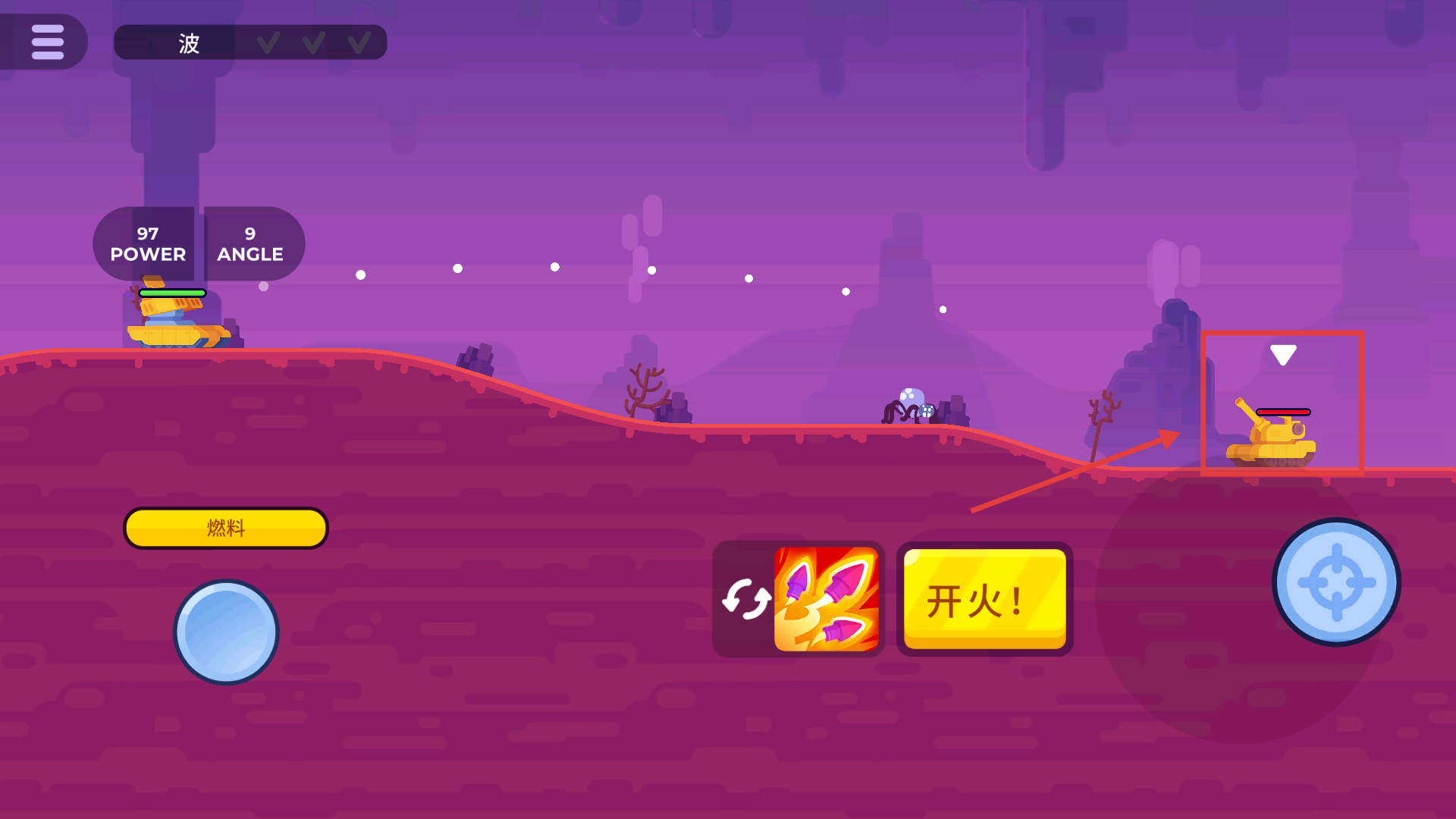 2、發(fā)射彈藥前查看右側(cè)彈藥選項,根據(jù)敵方位置與地形選擇合適類型,確定軌跡后點擊開火完成攻擊。