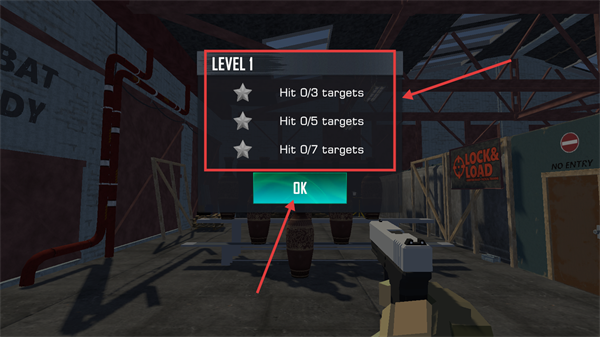 2、進入關卡查看【LEVEL1】目標,點擊【OK】確認,開始完成射擊任務提升技能。