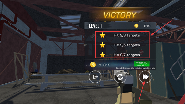 4、完成目標獲三星,領取【319】金幣,解鎖更強武器繼續挑戰新關卡。