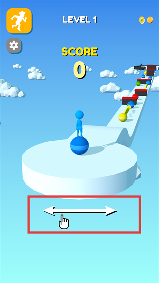 1、在【LEVEL-1】界面,通過紅框內(nèi)的左右按鈕,控制藍人腳下的球左右移動,調整位置。