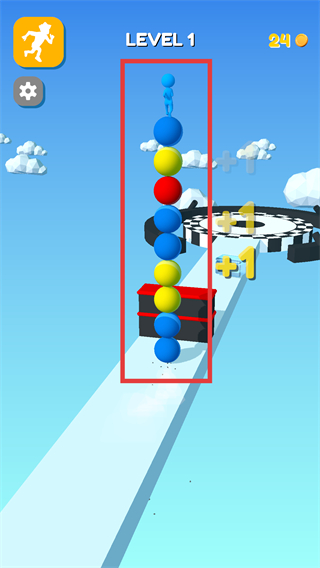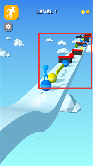 2、操控球移動到紅框內(nèi)的軌道區(qū)域,收集沿途的彩色球,積累堆疊的基礎道具。