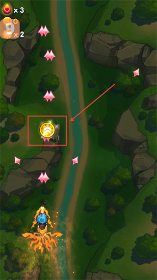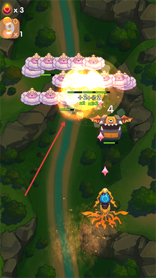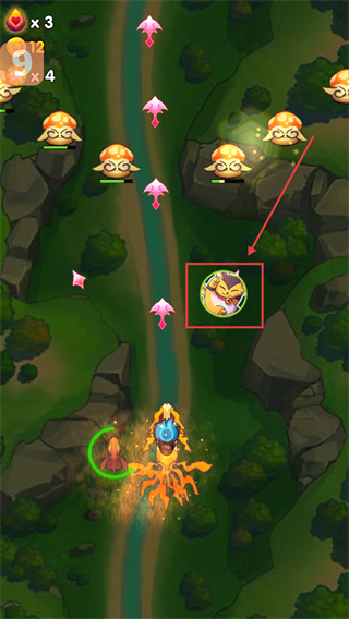 1、玩家需在滿屏攻擊中靈活閃避,釋放技能擊毀【粉色云朵敵人】,收集掉落的【金幣】-【道具】增強戰力。