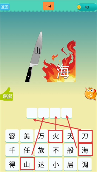 2、從字格選取【山】【火】【刀】【?!浚a全成語【刀山火海】,完成該關卡的成語猜測,推進游戲進度。