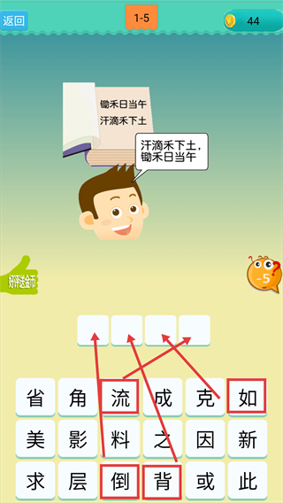 3、結合詩句倒背的提示,選取【倒】【背】【如】【流】,補全成語【倒背如流】,完成本關答題挑戰。