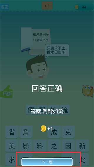 4、回答正確后顯示【回答正確】,獲得【+1】金幣,點擊【下一題】進入后續關卡,繼續積累金幣并挑戰新成語題。