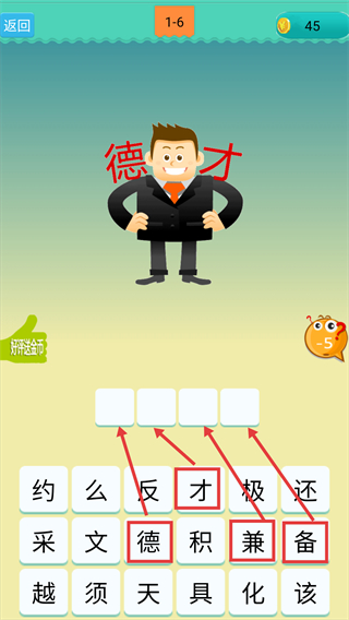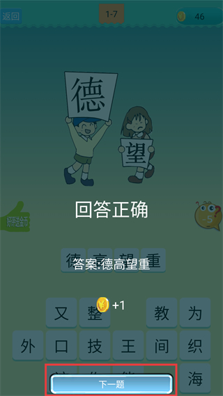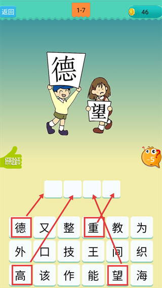 3、結(jié)合界面提示選取【德】【高】【望】【重】,補(bǔ)全成語【德高望重】,推進(jìn)關(guān)卡進(jìn)度。