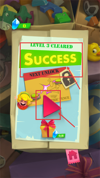 4、達成條件后會顯示【LEVEL-3-CLEARED】與【SUCCESS】,點擊紅色三角按鈕可解鎖下一關并獲取獎勵。