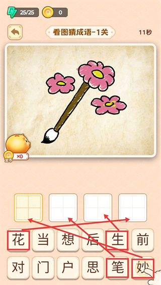 2、處于【看圖猜成語-1關】,圖案是花與筆,需選擇【花】【生】【筆】【妙】,組成成語【妙筆生花】來完成本關。