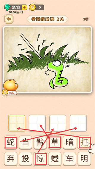 3、在【看圖猜成語-2關】中,圖案為草與蛇,選擇【蛇】【草】【驚】【打】,拼湊成【打草驚蛇】通關。