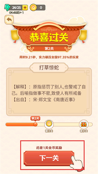 4、達成【恭喜過關】,用時【9.21秒】,點擊【下一關】按鈕可繼續挑戰后續關卡。