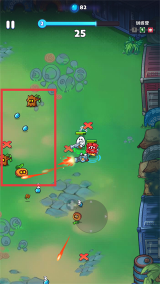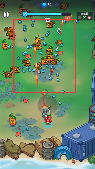 3、在敵人密集區(qū)域,攻擊【紅框內(nèi)】的集群敵人,收集大量【藍(lán)色道具】與【橙色道具】提升收益。