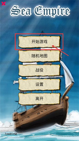 1、界面顯示【Sea-Empire】的主菜單,點擊標注的【開始游戲】按鈕進入游戲,可選擇后續的地圖、戰役等模式開啟玩法。