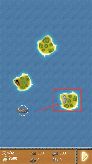 2、進入地圖界面后,選擇標注的島嶼,界面顯示【天1/50】等資源狀態,點擊島嶼可查看其詳細信息,推進游戲發展流程。