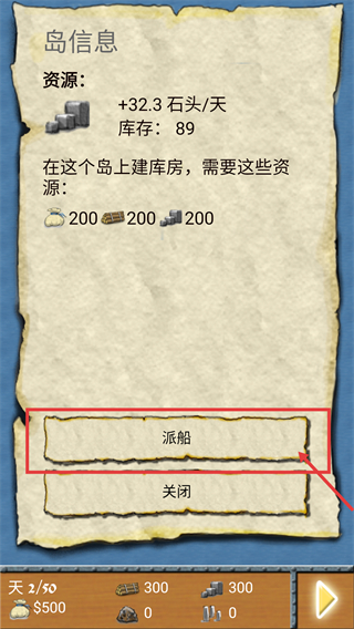 3、查看【島信息】,該島資源為【+32.3石頭/天-庫存89】,點擊【派船】按鈕調度船只,以便后續湊齊建庫房的資源需求。
