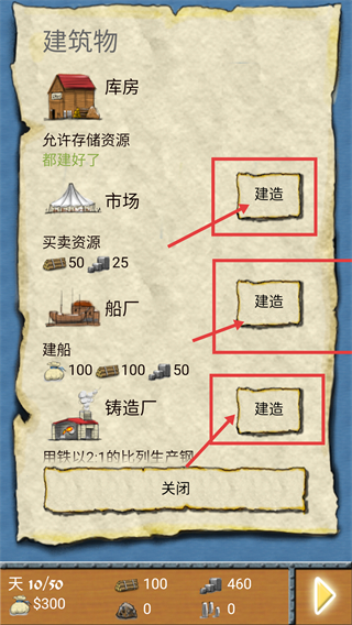 4、進入【建筑物】界面,庫房已建好,點擊【市場】【船廠】等建筑旁的【建造】按鈕,消耗對應資源來建設,提升資源管理能力。