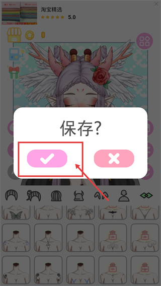 4、裝扮調整完成后,出現【保存?】彈窗,點擊標注的對勾按鈕確認保存,完成本次角色裝扮的自定義操作。