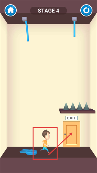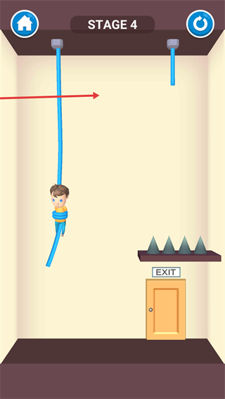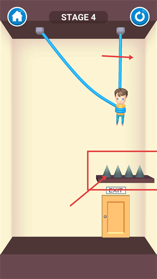 1、界面顯示【STAGE-4】,角色被藍(lán)繩束縛,點擊標(biāo)注的繩路區(qū)域調(diào)整路徑,需避開下方尖刺陷阱,向【EXIT】門推進逃生流程。