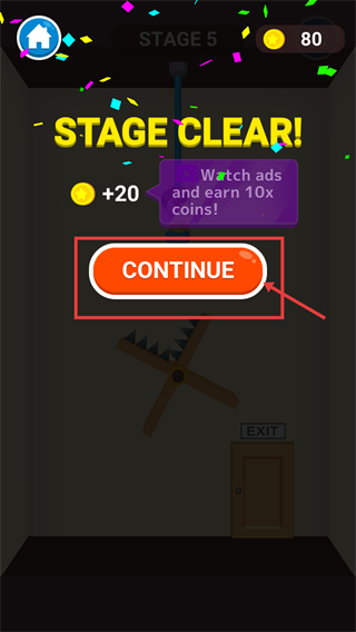 4、通關(guān)【STAGE-4】后觸發(fā)【STAGE-CLEAR!】提示,獲得【+20】金幣,點擊標(biāo)注的【CONTINUE】按鈕,進入【STAGE-5】。