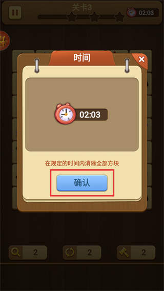 1、進入【關卡3】的時間提示界面,限時【02:03】,目標是【在規定的時間內消除全部方塊】,點擊藍色的【確認】按鈕開啟關卡挑戰。