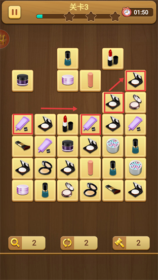 2、處于【關卡3】,在限時時間里,跟隨紅色箭頭匹配相同美妝方塊(如粉餅、乳液)。